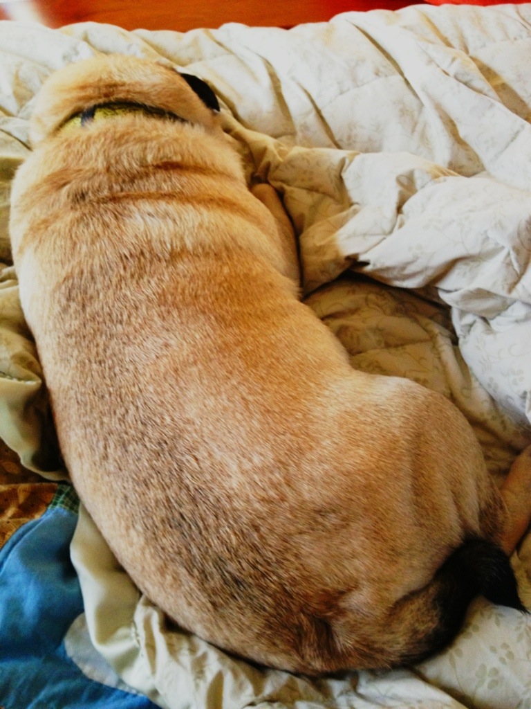 At my feet on the quilt is a happily snoozing pug – also snoring.