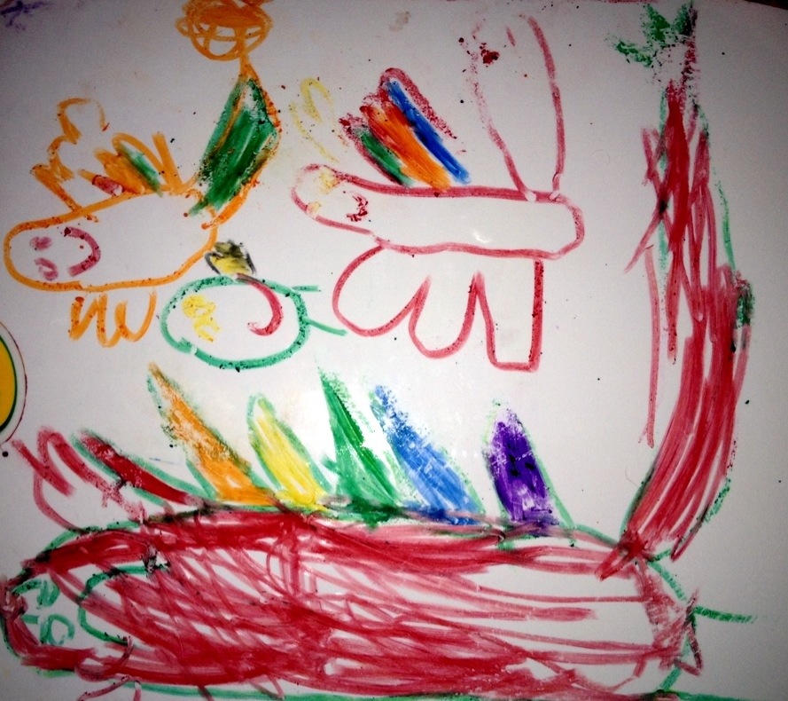 My daughter, S. Age 4.5 drew this for me tonight. She told me the big dragon, the daddy was upset that he couldn’t fly, but the others could and that the baby was very happy flying and playing games, and that the daddy should be happy because he is so big and colorful.