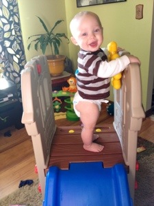 If he isn’t climbing up (and standing) on chairs, he’s climbing anything and everything else, so we brought out the kiddie slide to see what he’d do. Yup, figured it out in about 15 minutes.
