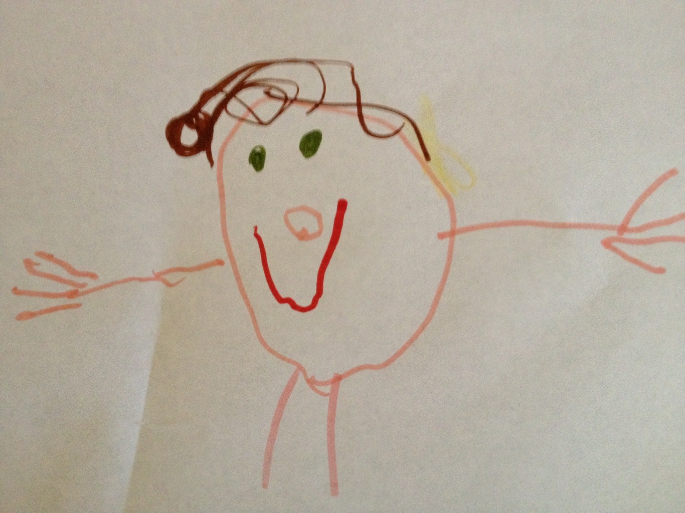 This is my daughter’s latest picture of me. Even though she is only three, notice the careful attention to detail: the green of my eyes, the yellow blob in my hair that is my highlight, and the giant smile on my face because she is, in her words, being such a good girl.